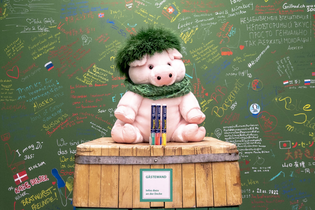 Hier dürfen sich unsere Gäste „verewigen“. Dieses besondere Gästebuch wird sehr intensiv und kreativ genutzt und hat innerhalb kürzester Zeit zu einer interessanten Sammelsurium aus Kommentaren und Grüßen von verschiedensten Gästen unterschiedlichesten Alters und Herkünften. Einfach eine Farbe auswählen und los geht’s. Werden Sie auch ein bleibender Teil unseres Bratwursthotels! Viel Spaß!